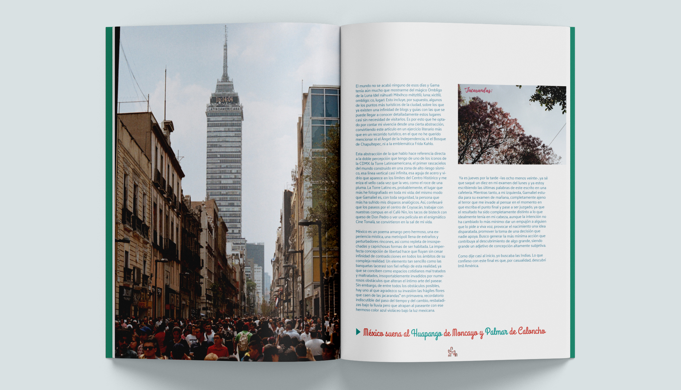 Editorial design, illustration, art direction ... Creation, approach, and development of a zine about architecture, travel and lifestyles. It aims to be an independent magazine, which differs in aesthetics and contents of the current market. Its aesthetic is marked by the presence of photography, the typographic combination and the recurring use of the inclined bar to mark milestones throughout the publication. Taking care of all kinds of details from the kickers to the numbering, which varies in color throughout the publication. Classic editorial compositions are studied and marked columns are found, playing with colors, shapes and their dispositions.