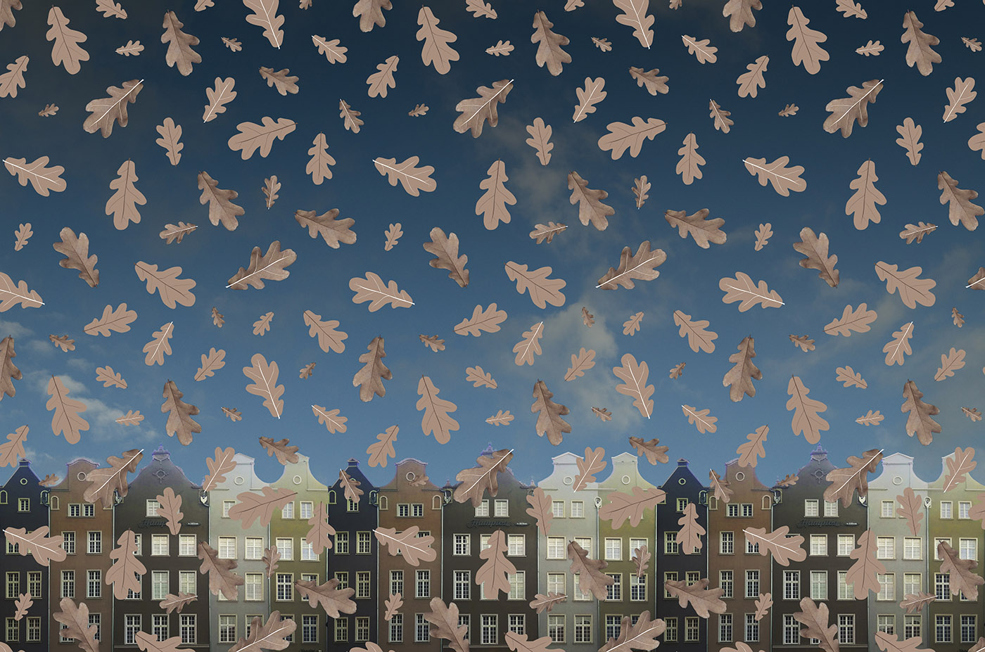 This is a personal collage that started after a leaves pattern that I created with white background. I was in love with that pattern, and one day while I was starring at it I thought that it would be a nice idea to experiment with it over other backgrounds and possibilities. So I took a pic of one of my favourite thins in Gdańsk, the old town buildings, and rectified it, to create also a buildings pattern (I also experimented with it possibilities, but that is another project).