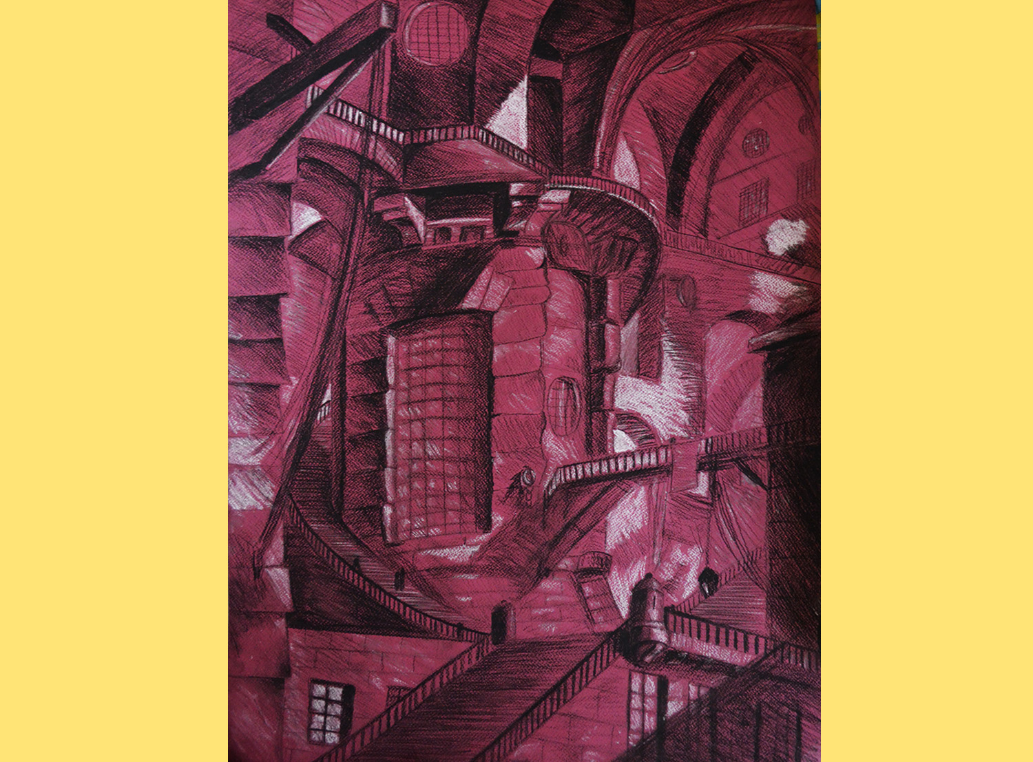 Charcoal and white chalk over pink paper, 50x70. Personal interpretation of imaginary prisons by Giovanni Battista Piranesi.