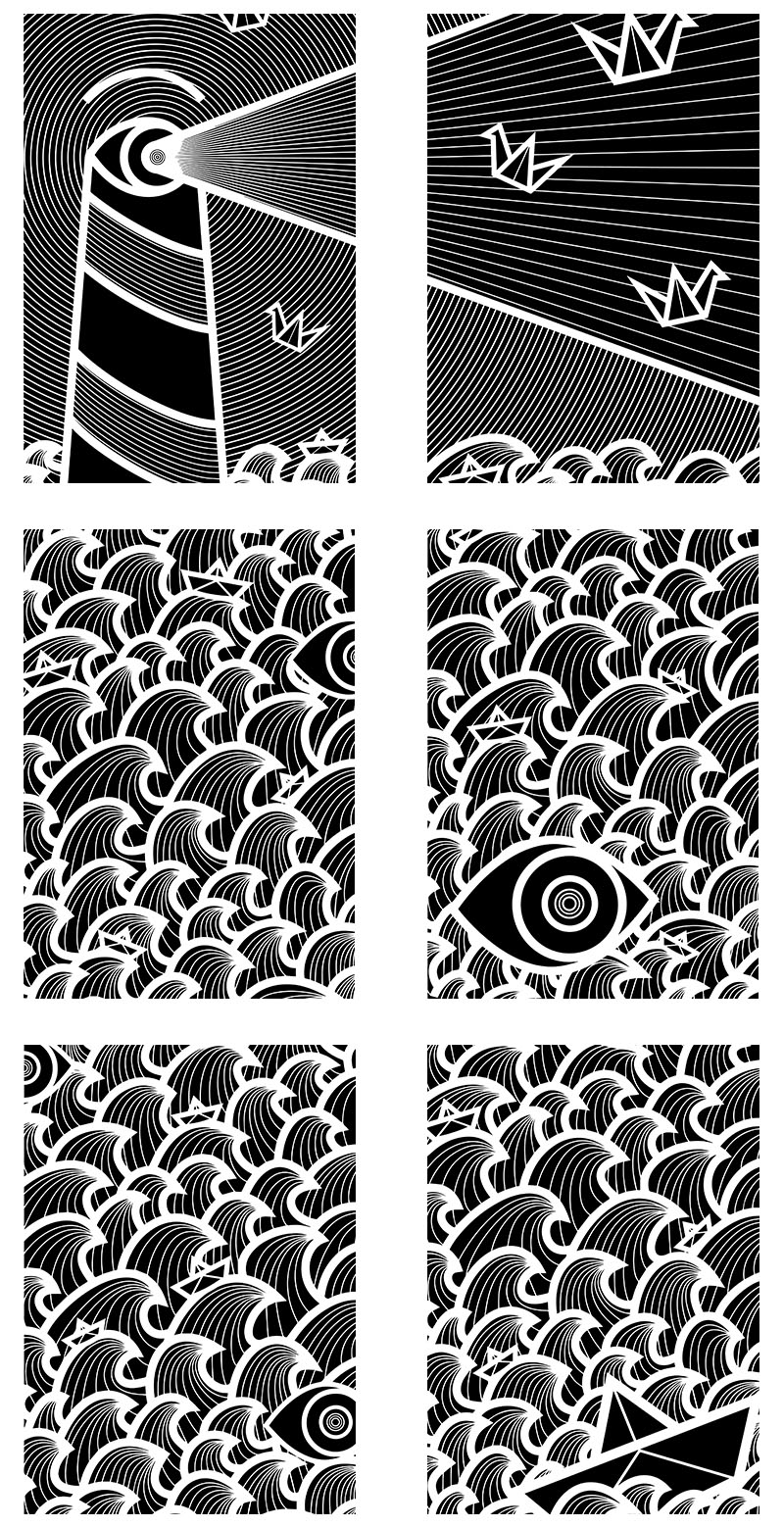 Flat illustration with the motive of designing a false stained glass window. The motif of the sea with surrealist dyes is chosen, the cranes and the boats are drawn as if they were origami and the focus of the lighthouse is an eye.