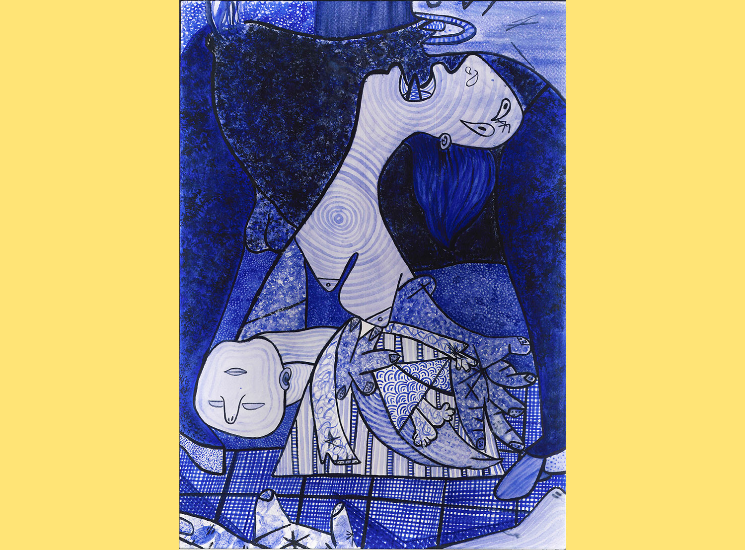 Personal interpretation of Pablo Picasso's Guernica, monochromatic with black ink and a blue watercolor.