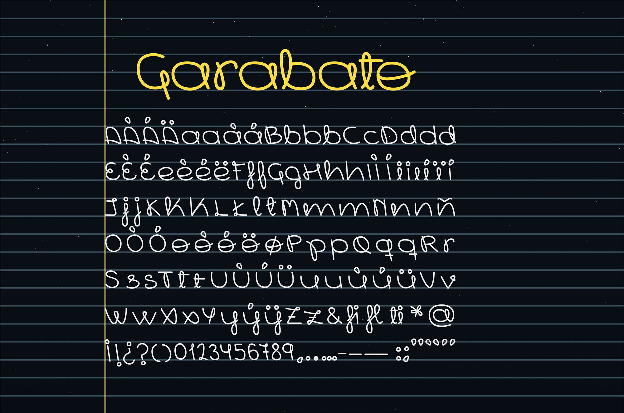 Garabato is a display script typeface based on my own handwriting. It has all the characters for english and spanish, and soon will be expanded and I will develop all the latin characters. This typeface has many alternate letters to remark its manual personality.