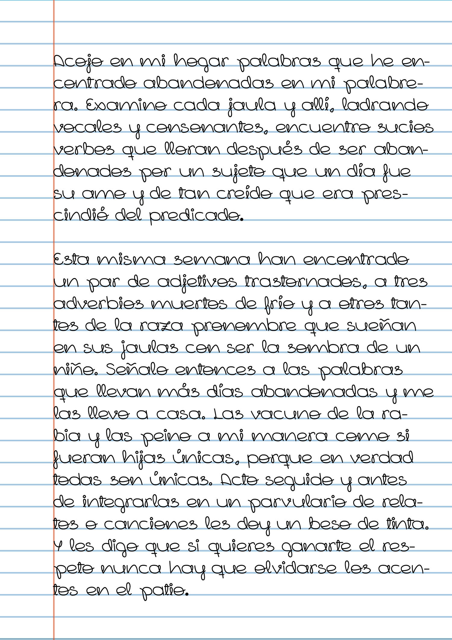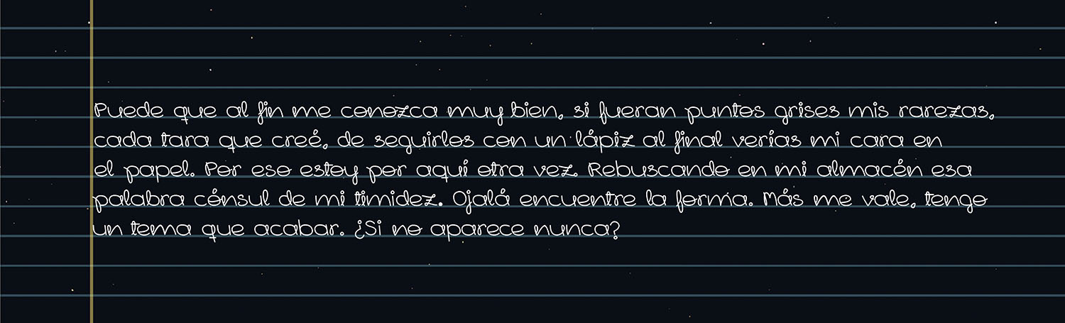 The loops present in the letters are a strong part of this typeface presence. It also has one more quirk from my handwriting, the letter g is settled on a straight line and not a curved one, as it would be usual in the bowl.