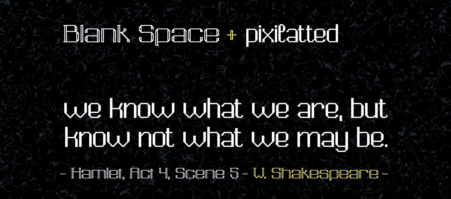It can work also together with the Blank Space font or separately, due to their differences and similarities. Both are characterized for their geometric forms and each has their own presence or feature; Pixilatted has loops in many letters while Blank Space has those empty spaces on the stems,