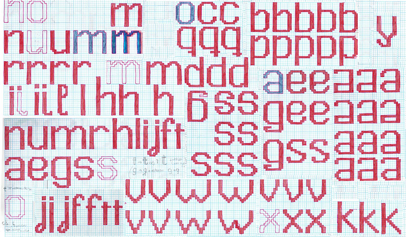 For this typographic experimentation I began working on graph paper, starting from a first drawing that I made to study the form of letters with the less number of pixels, and developing later this forms variety allowed by the use of pixel in different amounts and proportions, coming up with the design of this two typefaces.