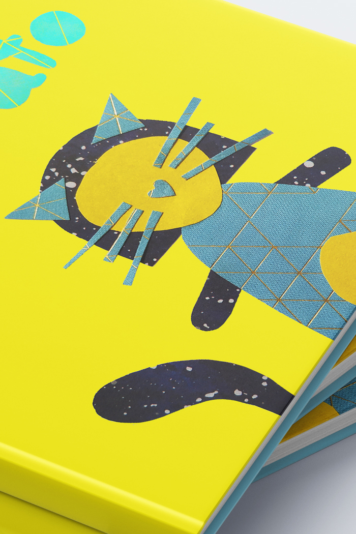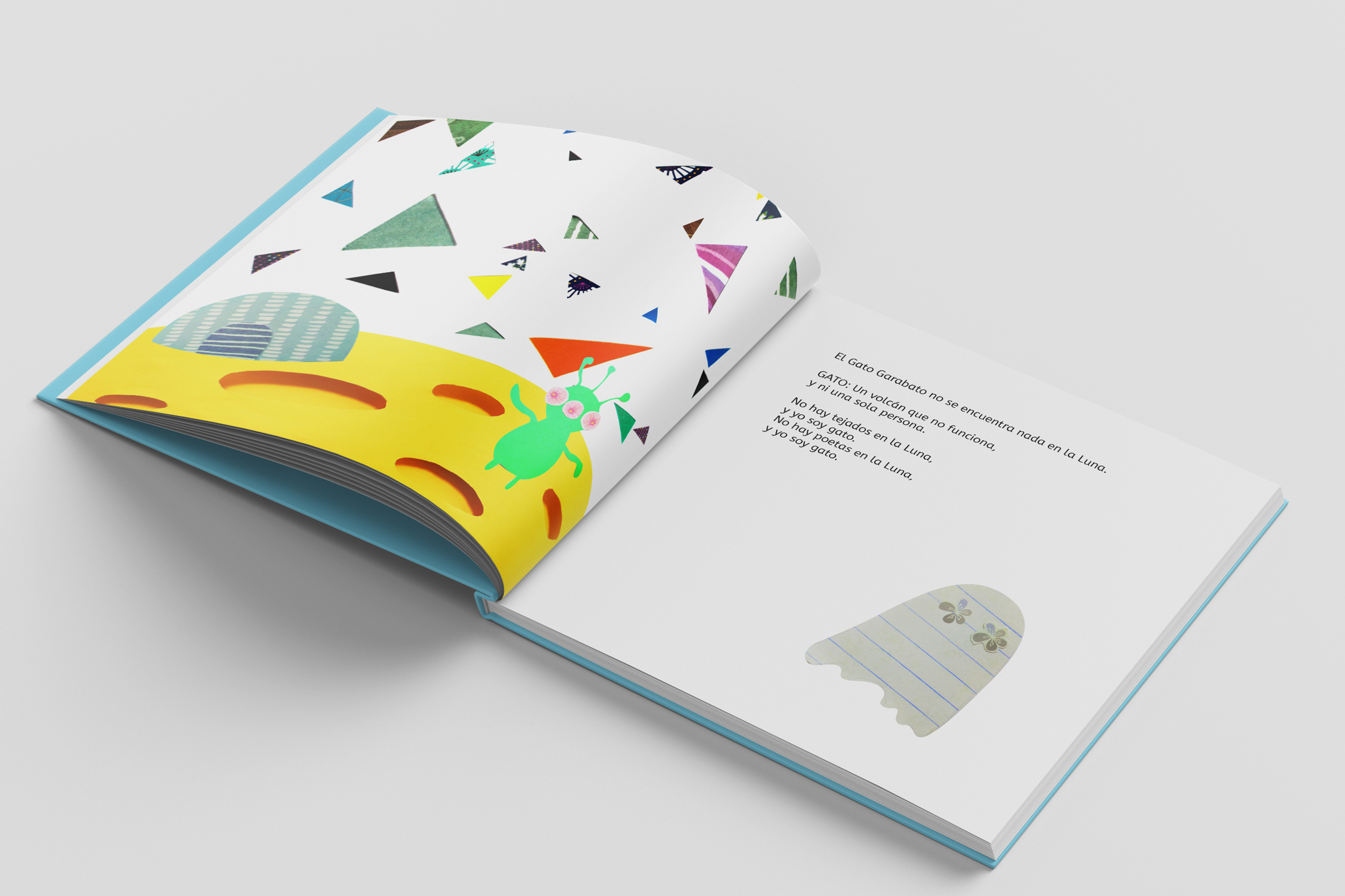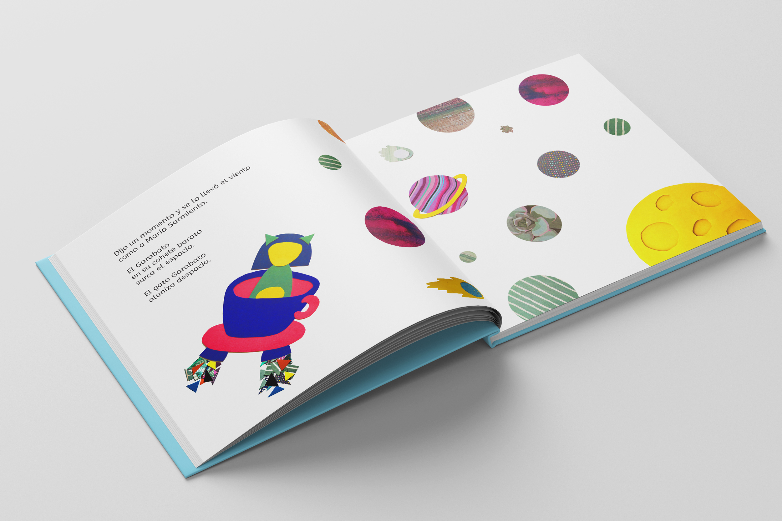 Design of a children’s book using collage to make the illustrations. The combination of numerous textures and colors is thought to attract the attention of the little ones to reading. Looking for shapes that break with the usual way assigned to the concepts, a cup is used characterized as a rocket and the cat is personified. Both elements maintain the identifying features of each concept, but at the same time they leave the collective imaginary, thus seeking to foster children’s creativity and imagination.
