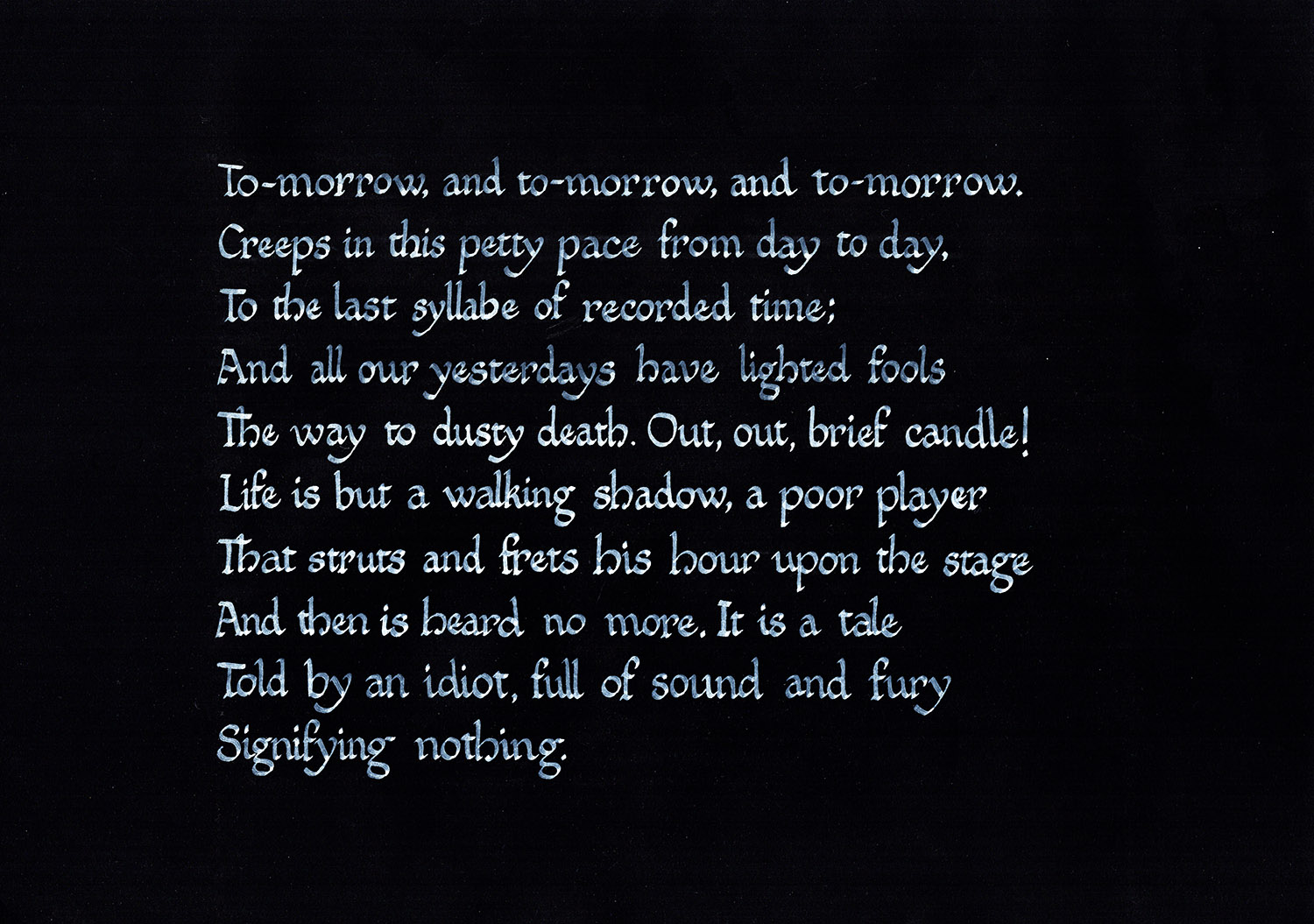 Humanistic calligraphy using 1.9 nib over black paper, trying the white ink from winsor and newton. The text belongs to Macbeth soliloquy by William Shakespeare.